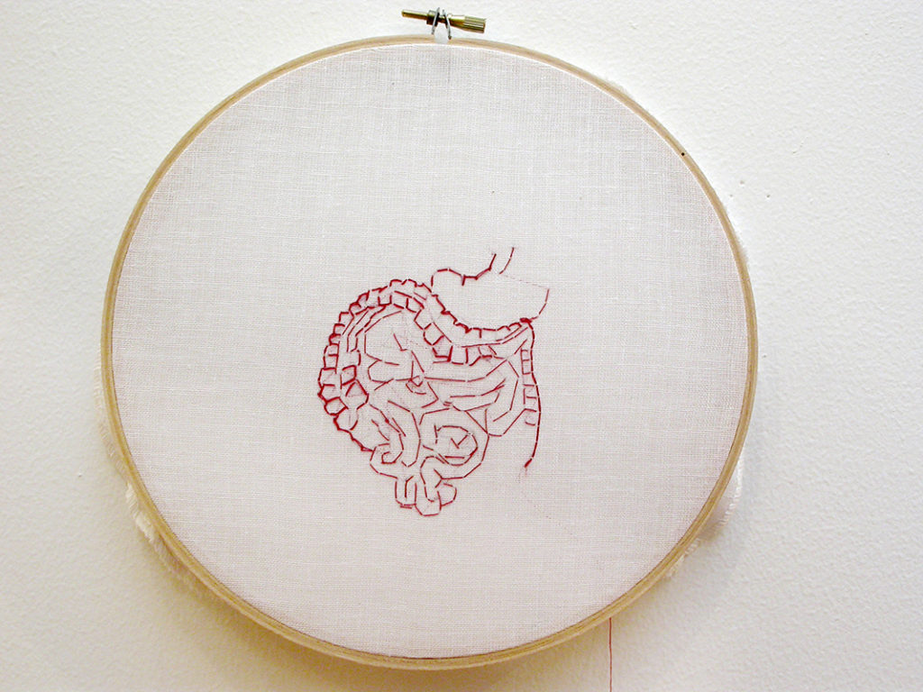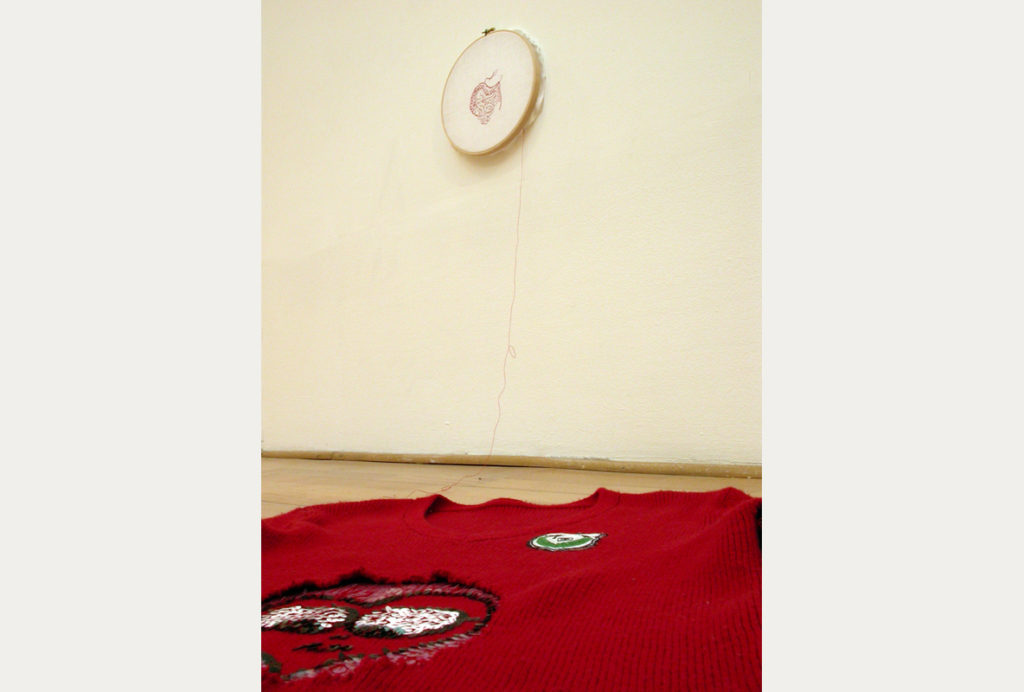 Bordado hecho a mano -con lana de un saco de colegio destejido- sobre organza tenzada en un tambor de bordado de 20 cms. de diámetro; e imagen realizada con lentejuelas sobre el mismo saco.