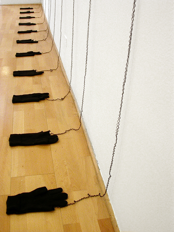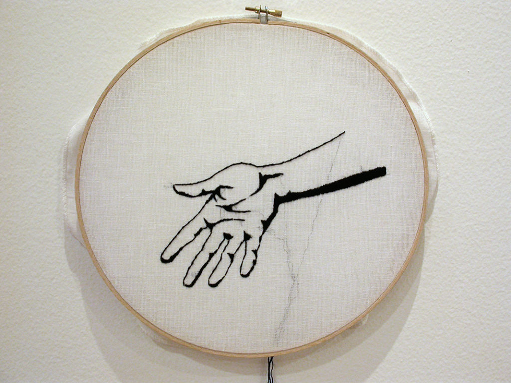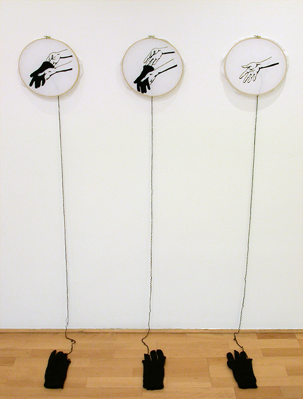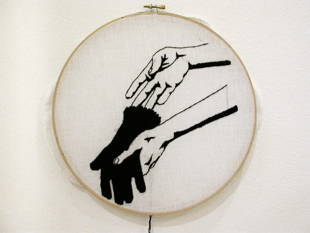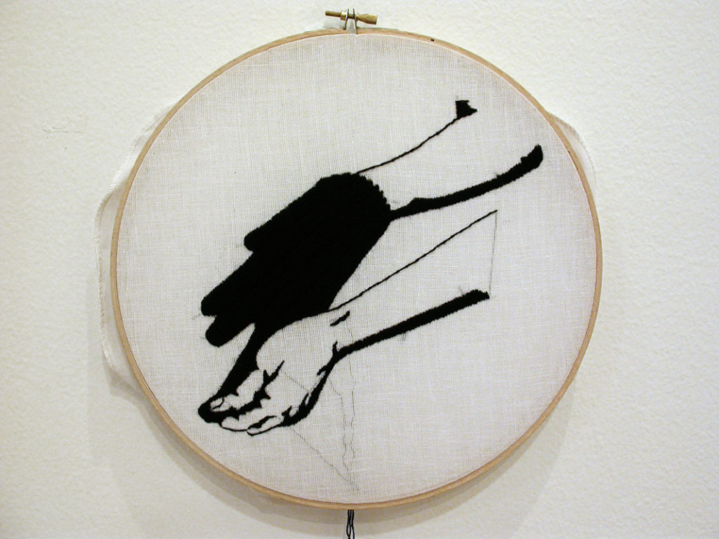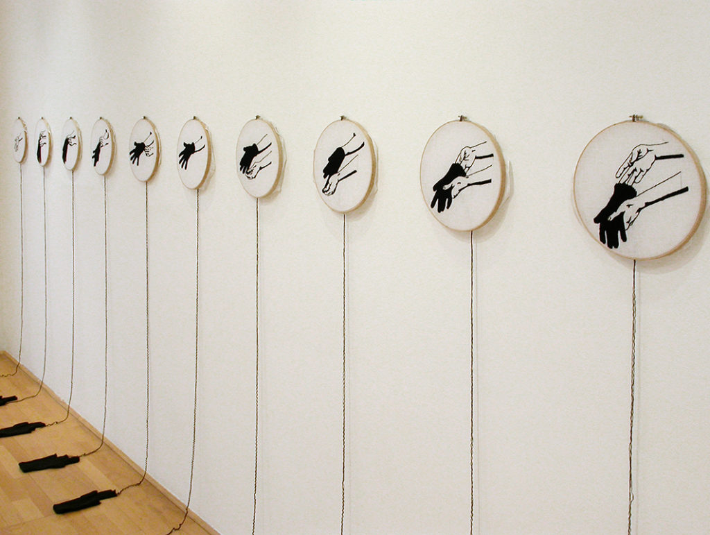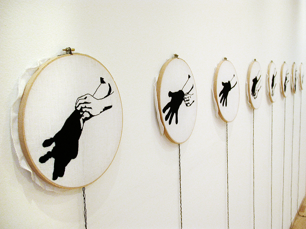 Once bordados hechos a mano -con lana sacada de guantes tejidos- sobre organza tensada en tambores