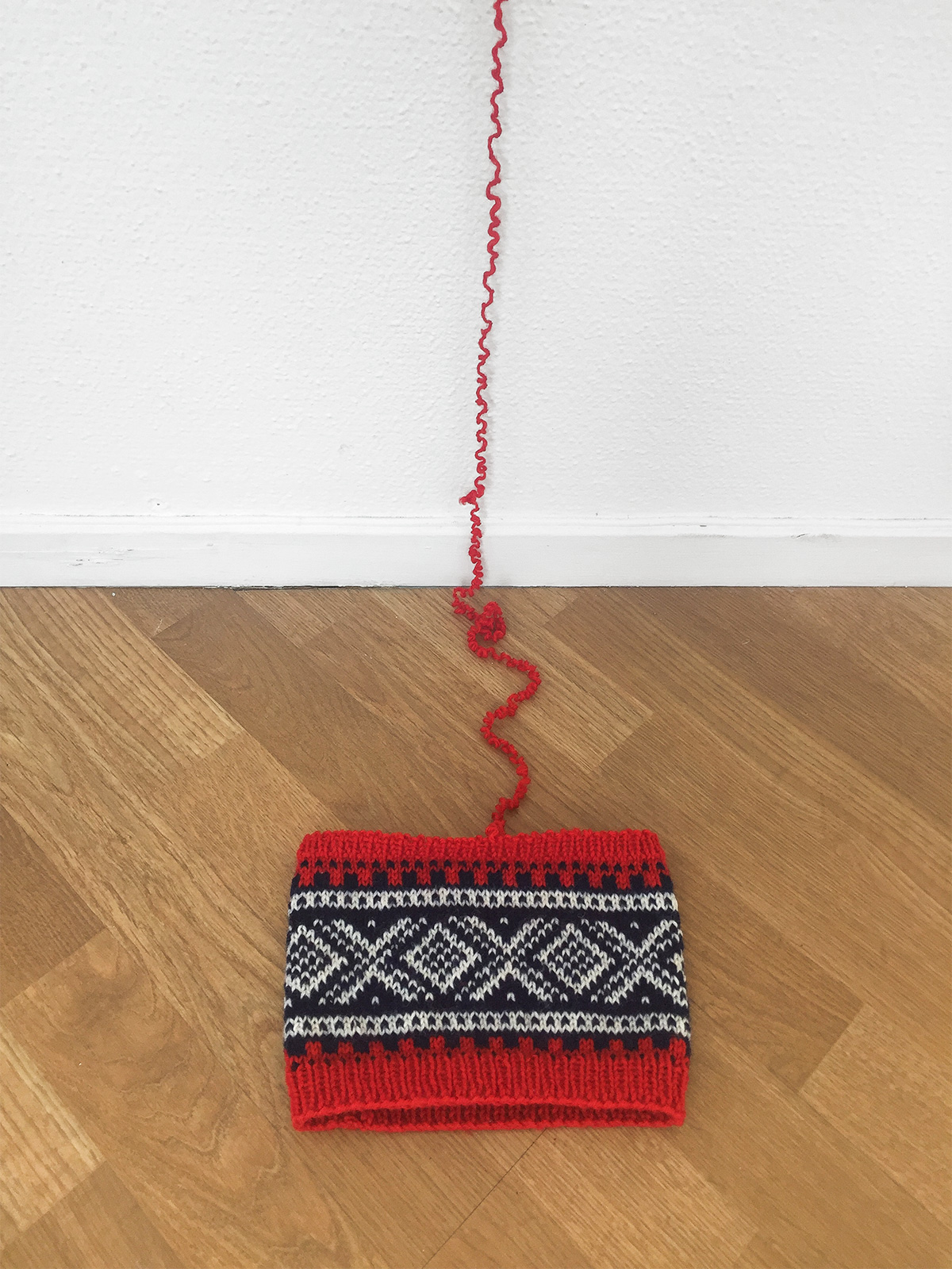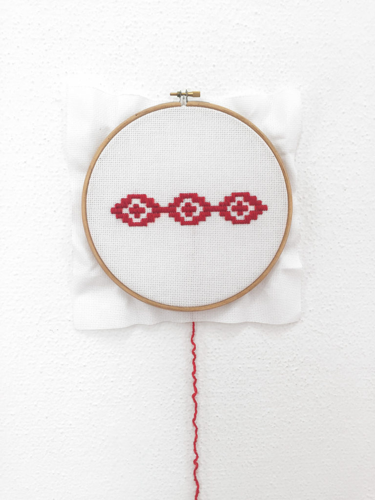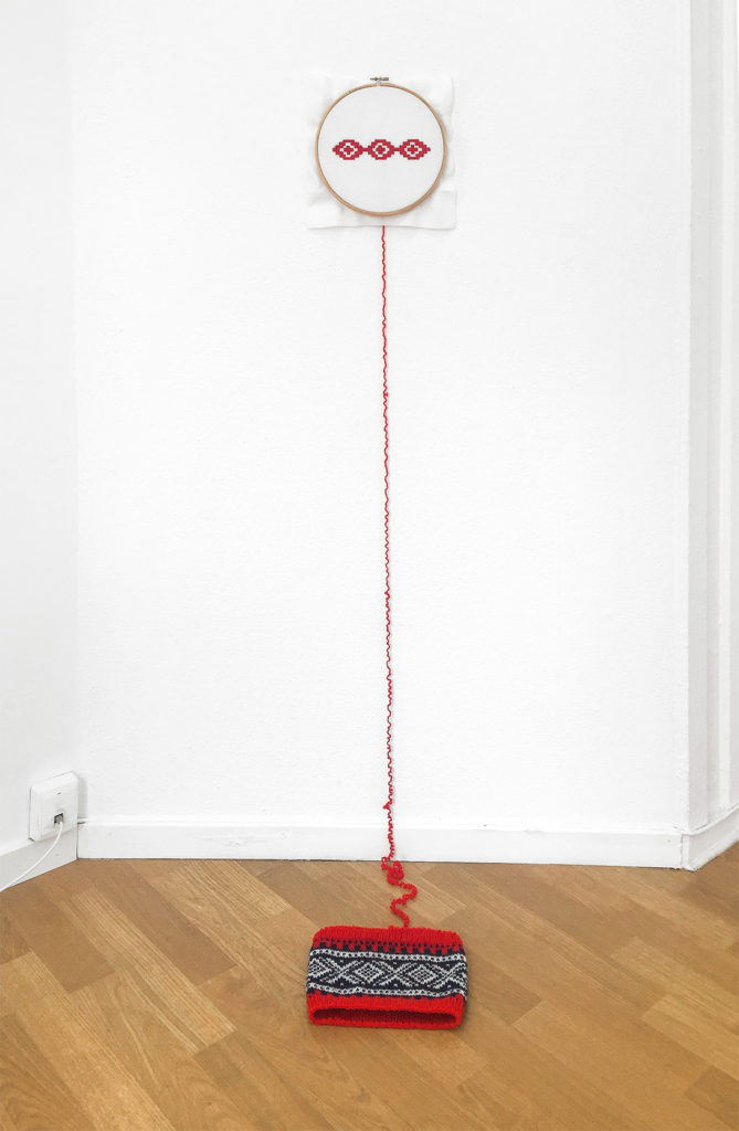 Bordado hecho a mano con lana de un cuello noruego. El bordado está tensado en un tambor de madera de 21 cm de diámetro.