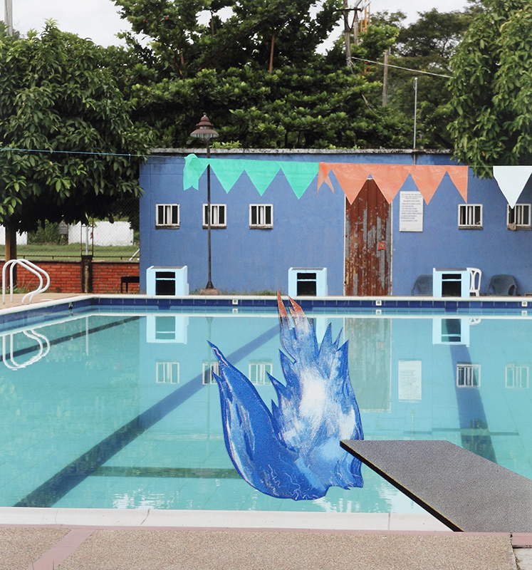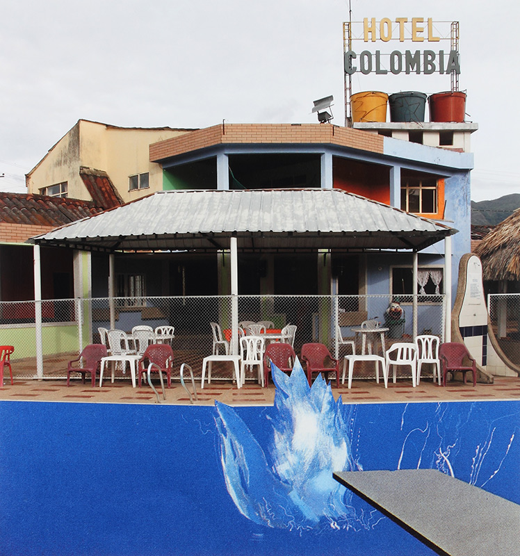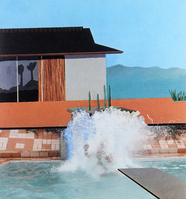 Collage a partir de fotografías recortadas de piscinas de Melgar y de ampliaciones digitales de una reproducción impresa de “A Bigger Splash” de David Hockney. Estos tres collages fueron presentados en la exposición colectiva Melgart Arte de Paseo en el MamBo. Cada collage mide 50 x 46 cm