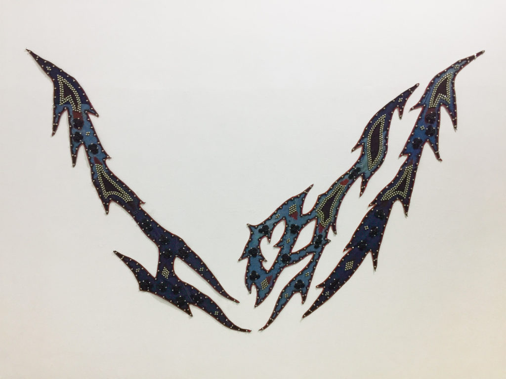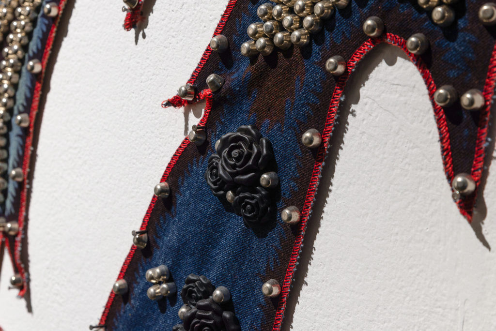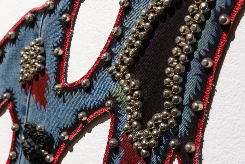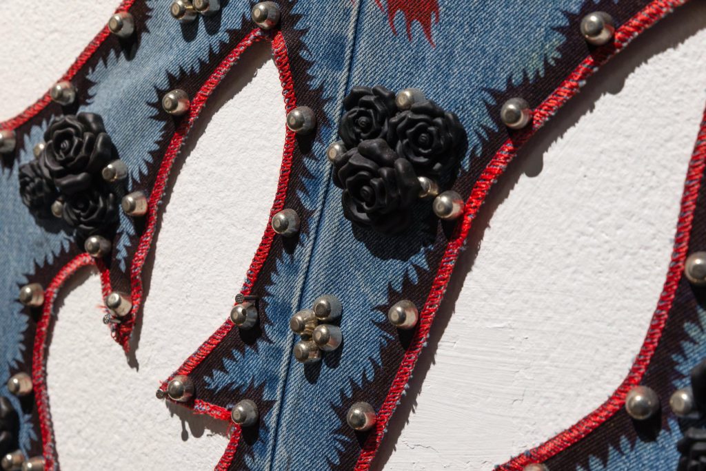 Tela de jeans usados, dibujo en bolígrafo, taches y botones