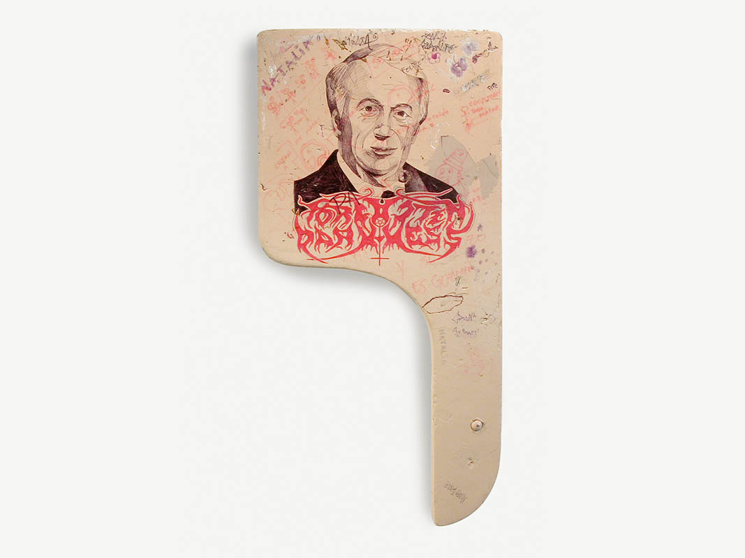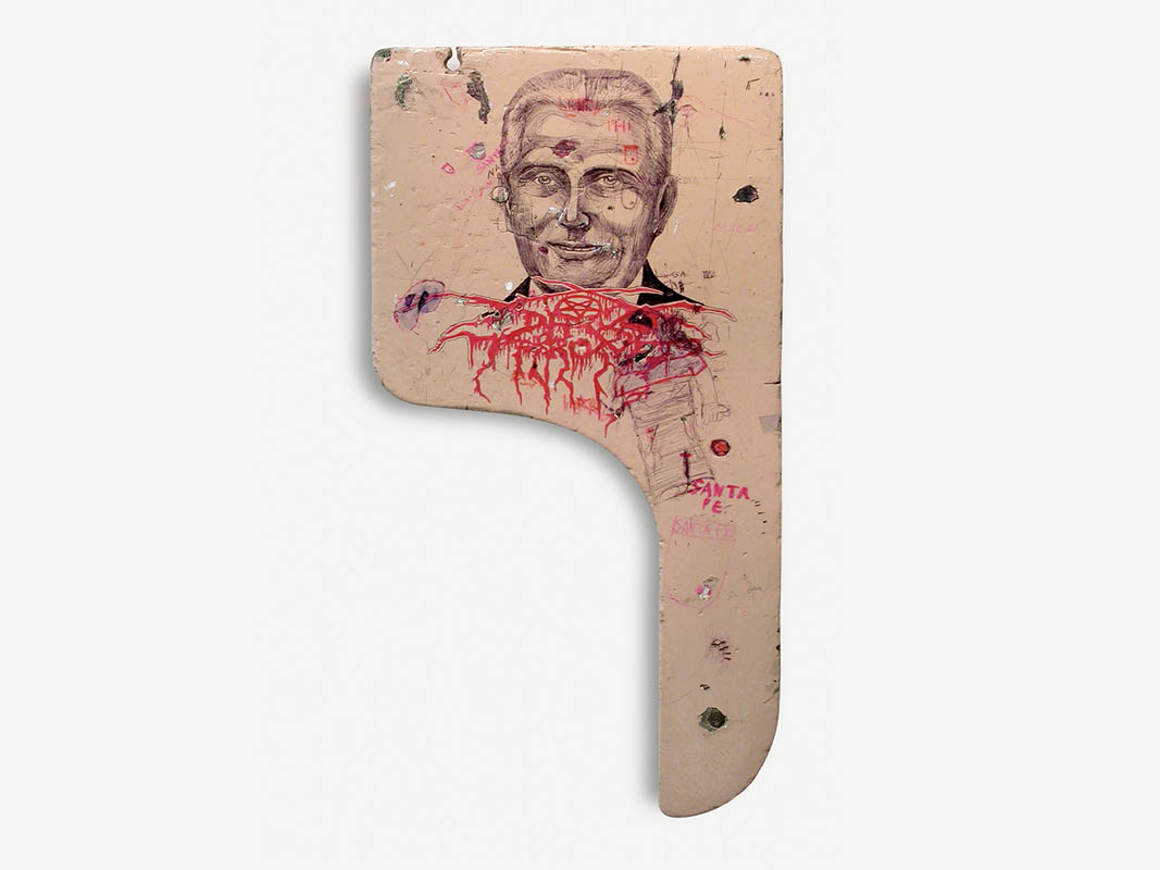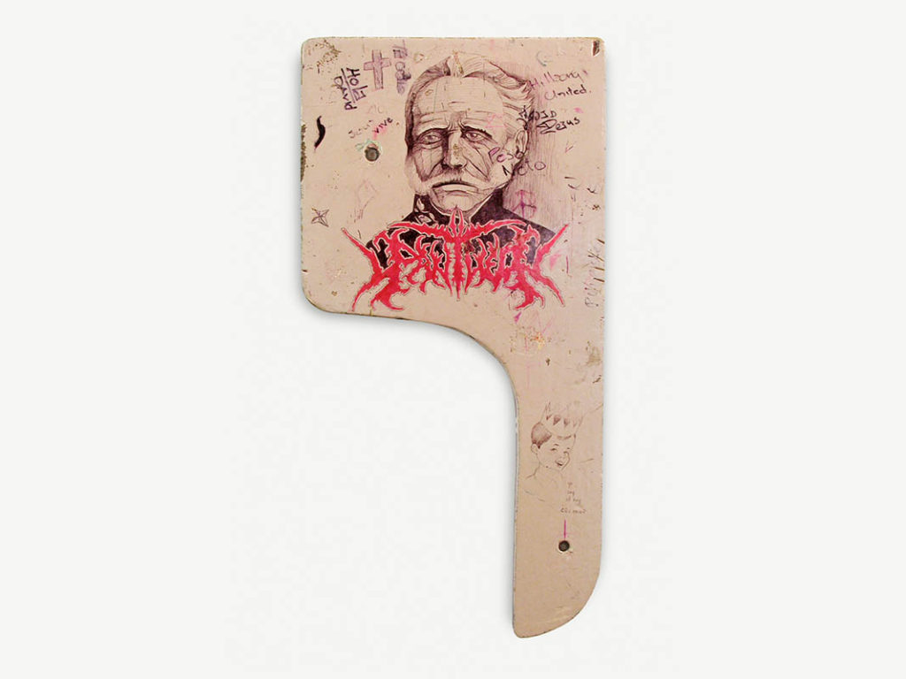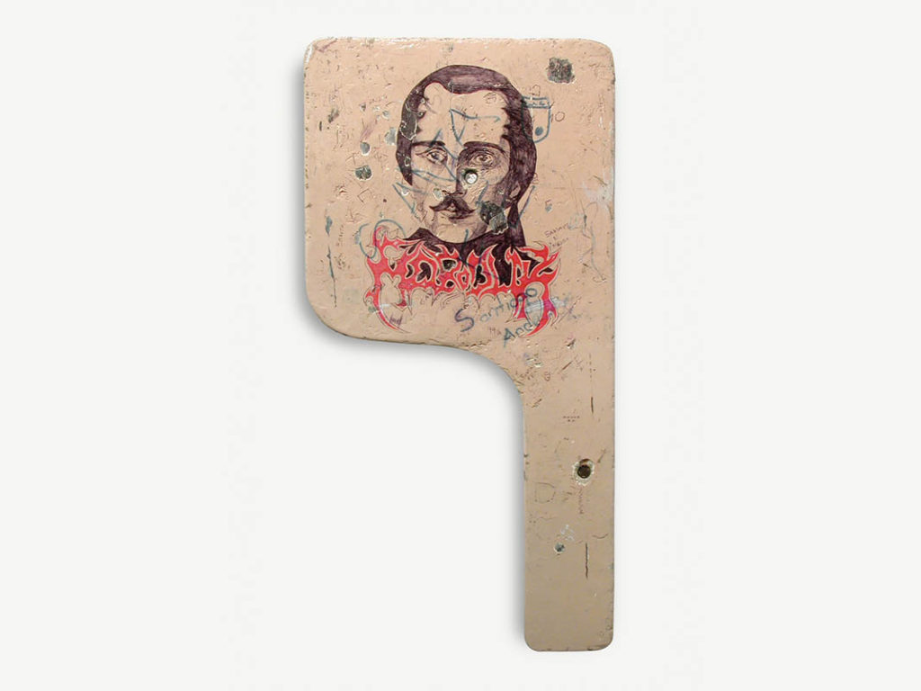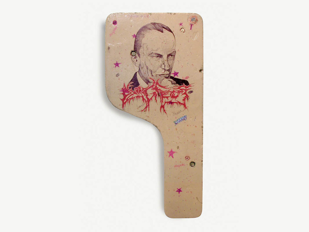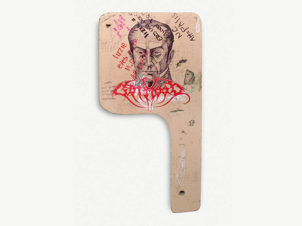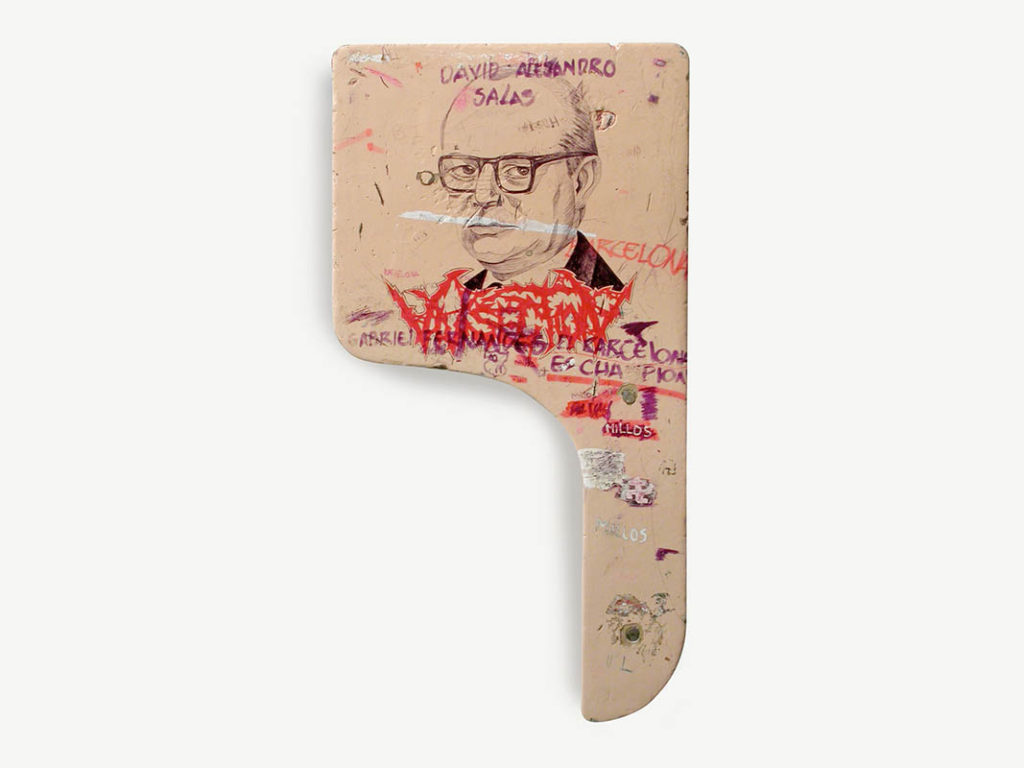Dibujo con esfero de tinta negra y roja, sobre quince tablas (brazos) de pupitre de colegio, para diestros.