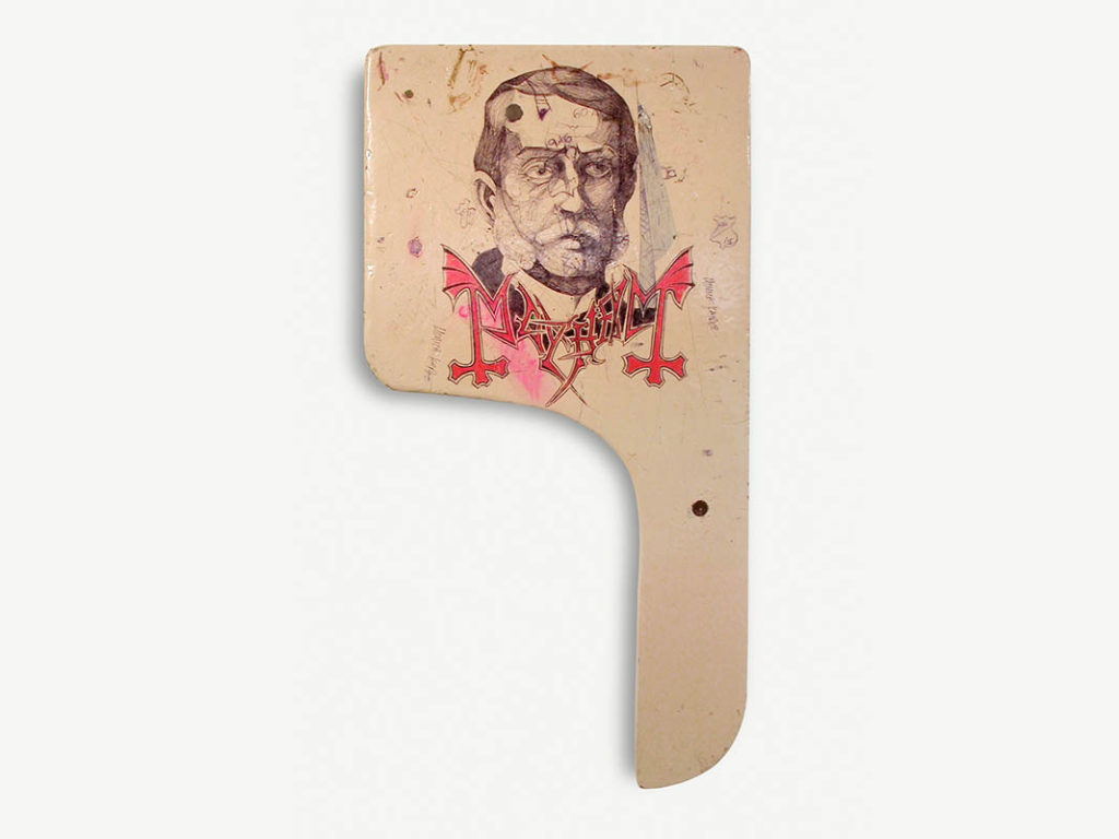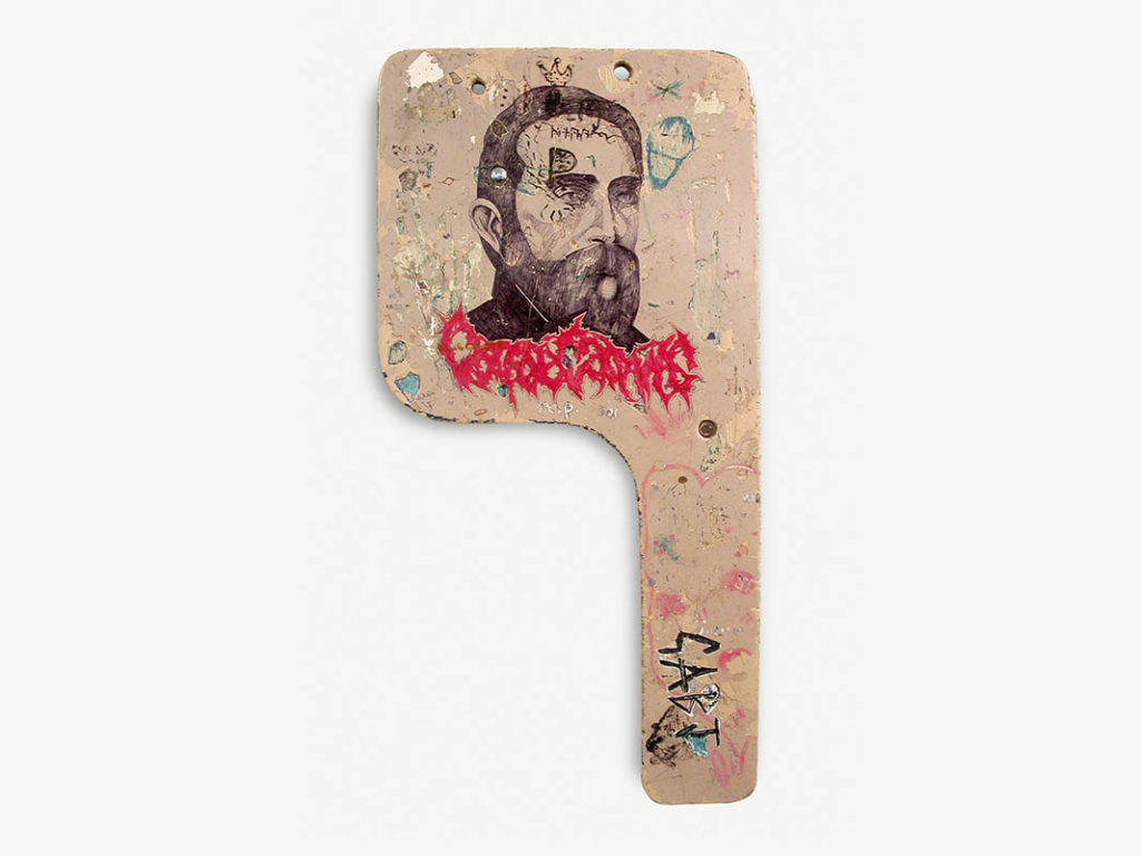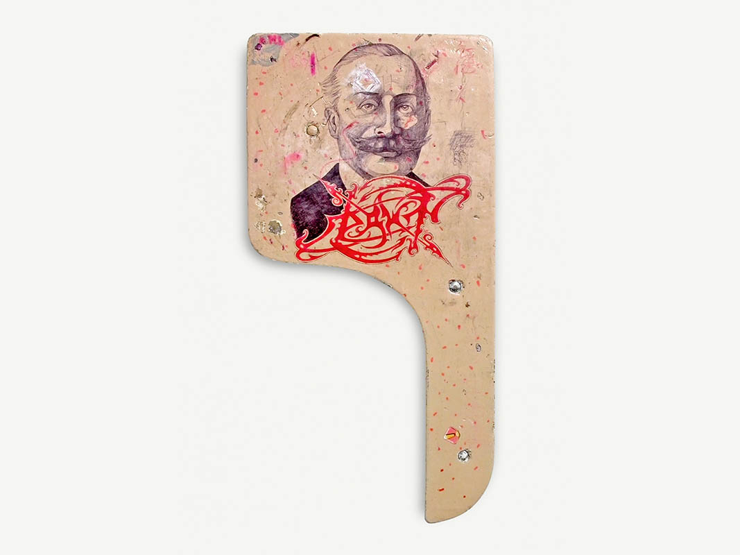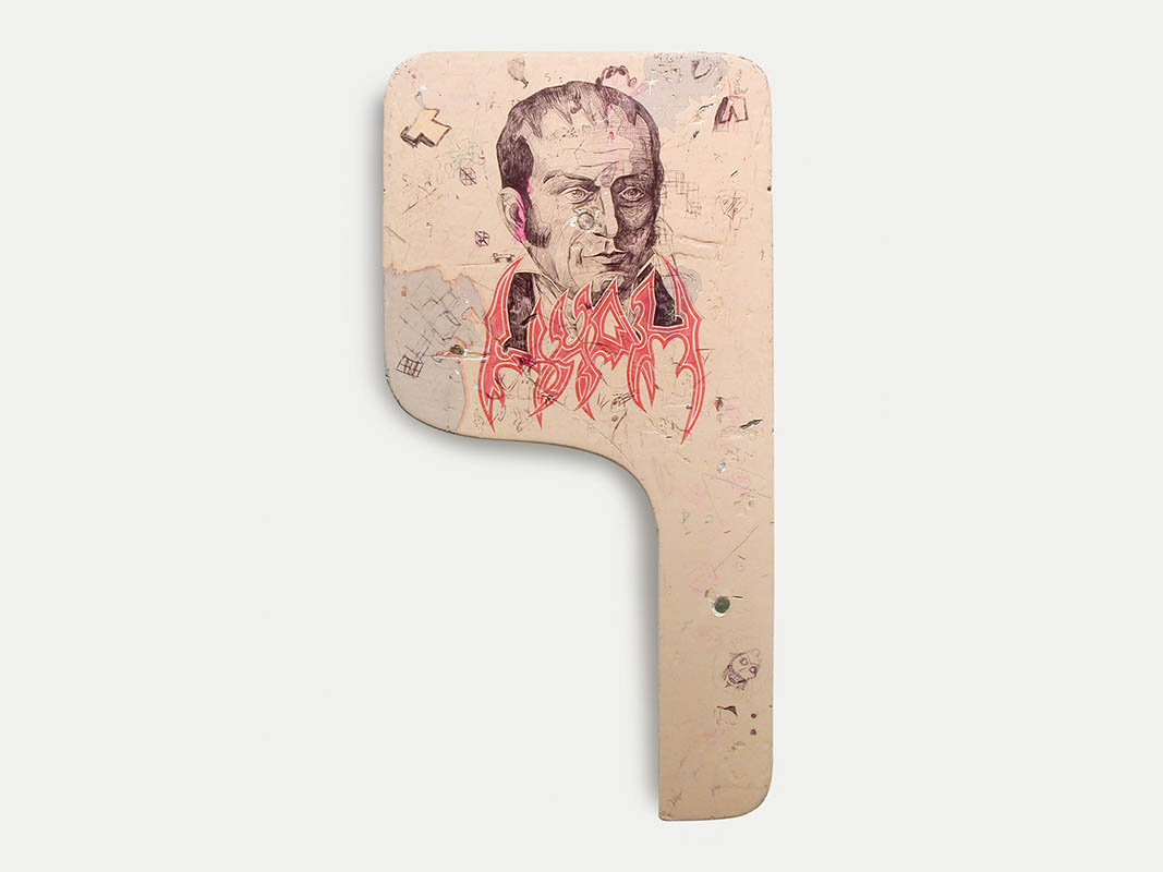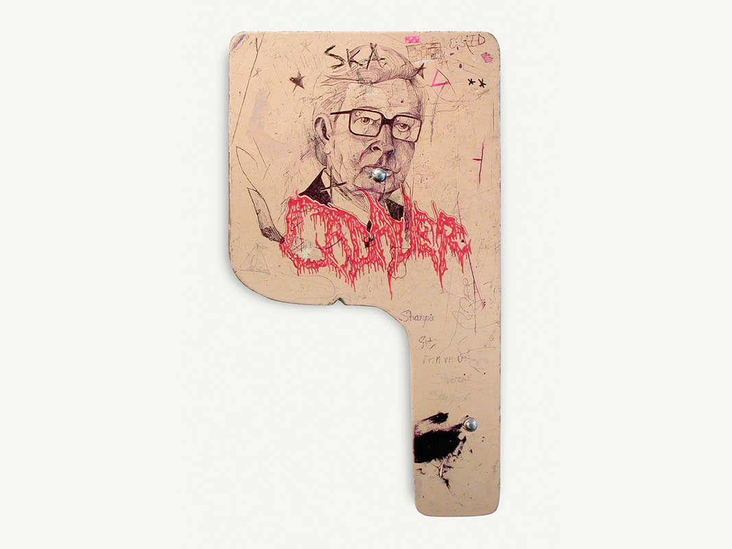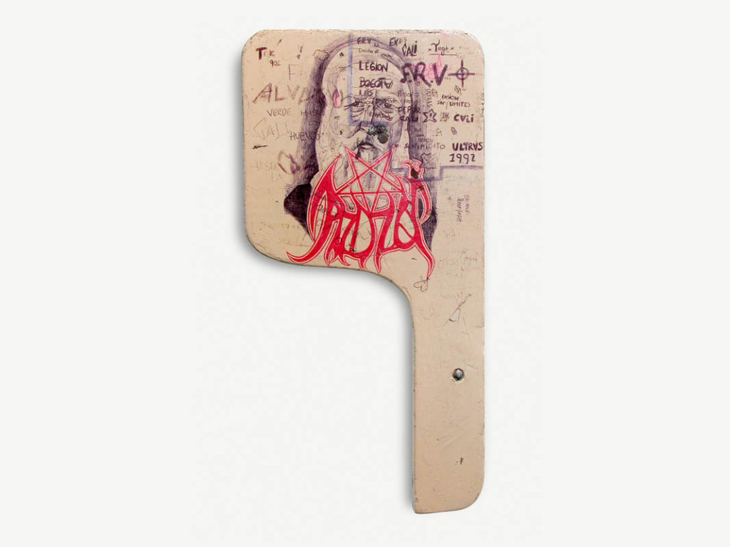 Dibujo con esfero de tinta negra y roja, sobre quince tablas (brazos) de pupitre de colegio, para diestros.