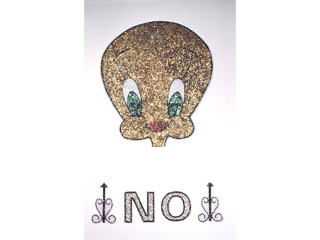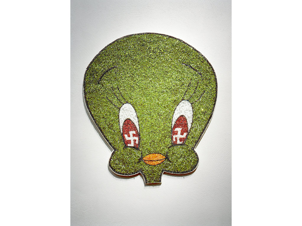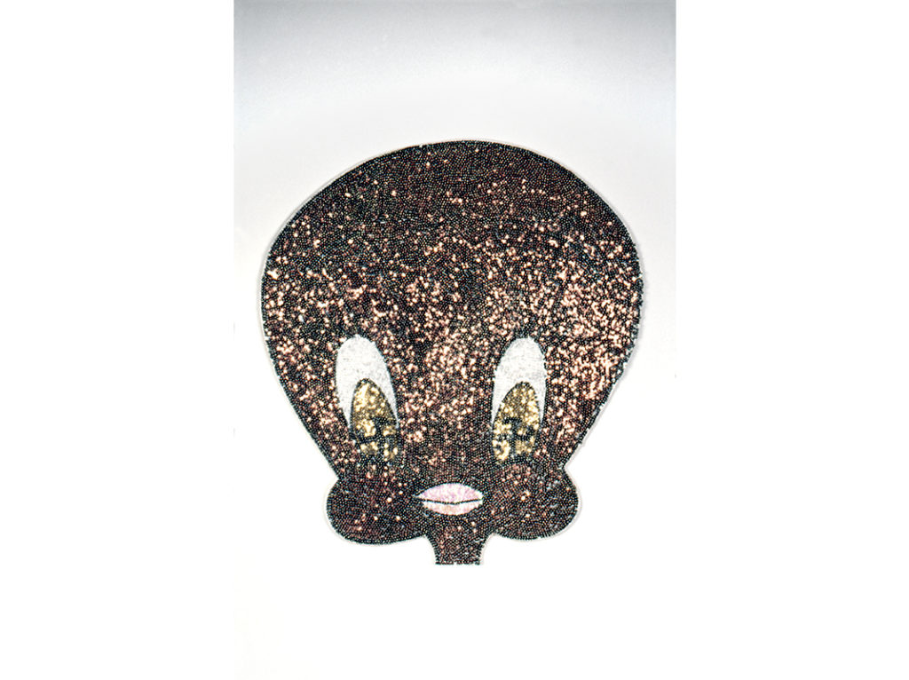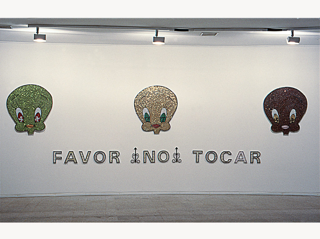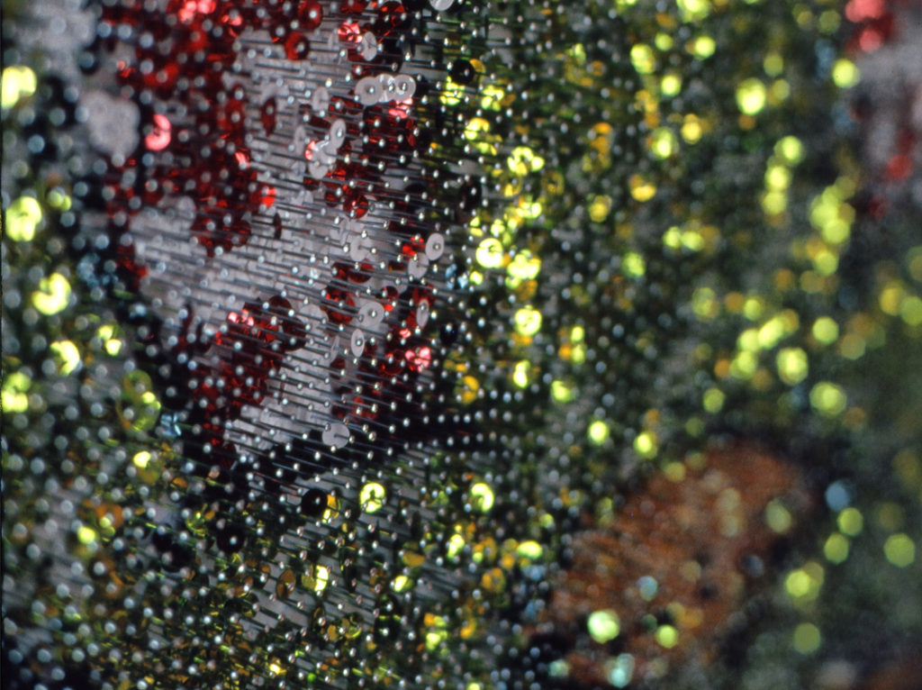 Lentejuelas y alfileres sobre icopor (cada cabeza). V Salón de Arte Jóven. Galería Santa Fe, Planetario de Bogotá.