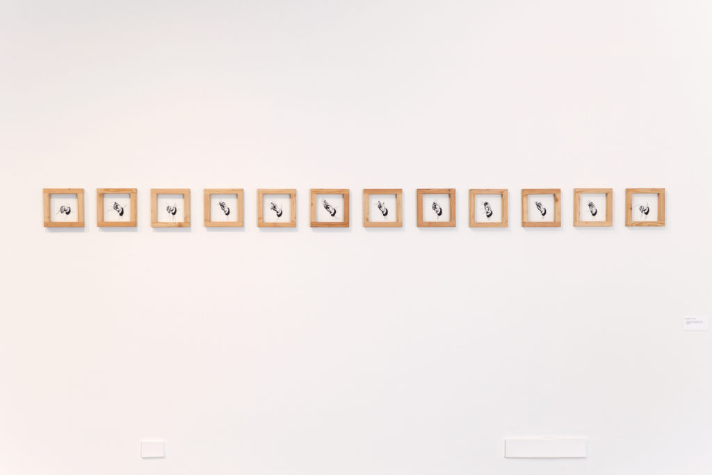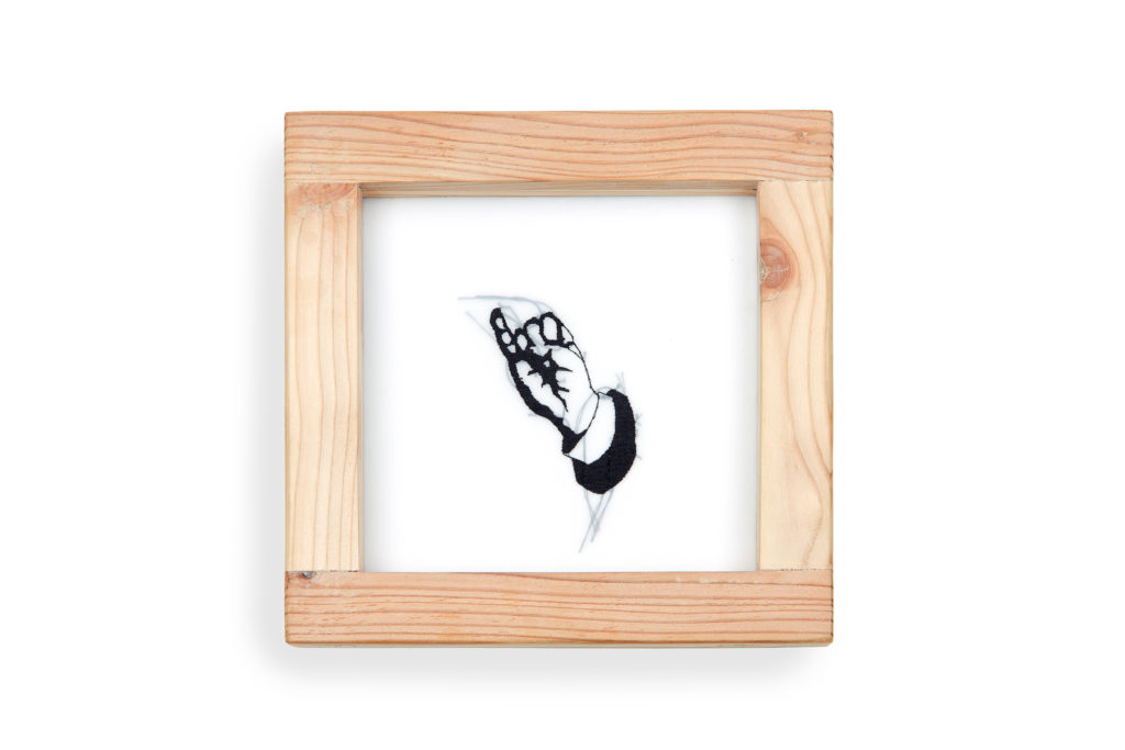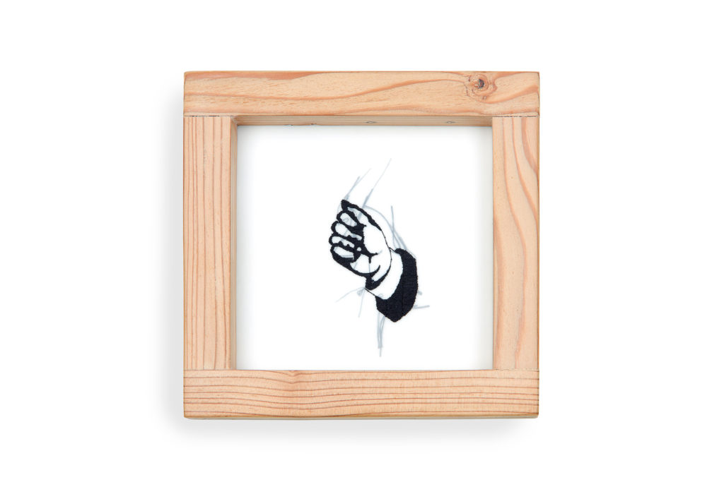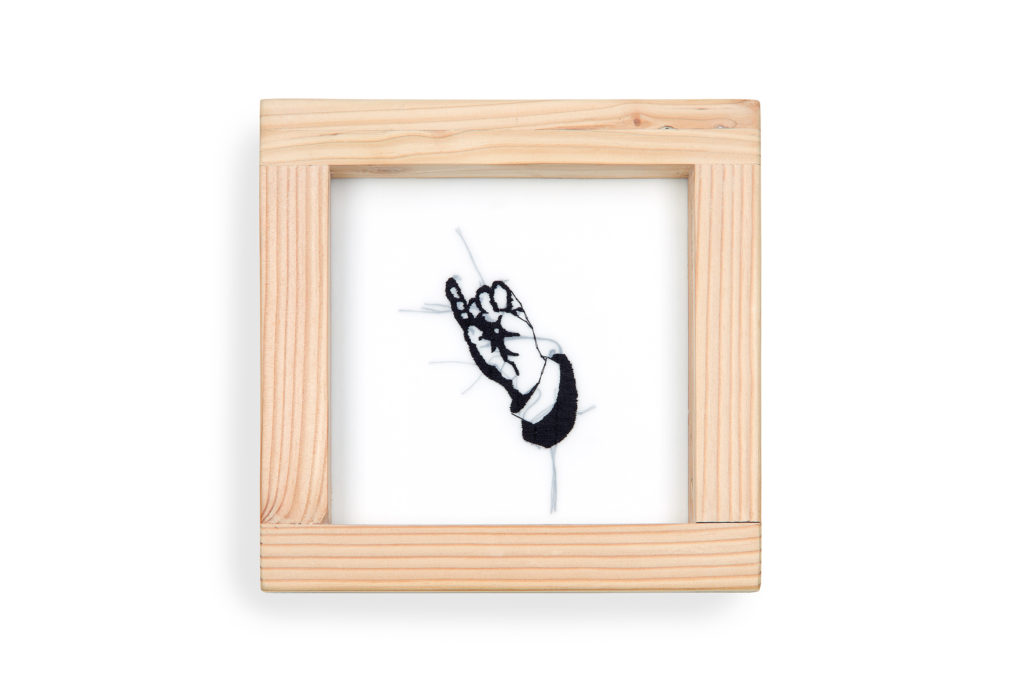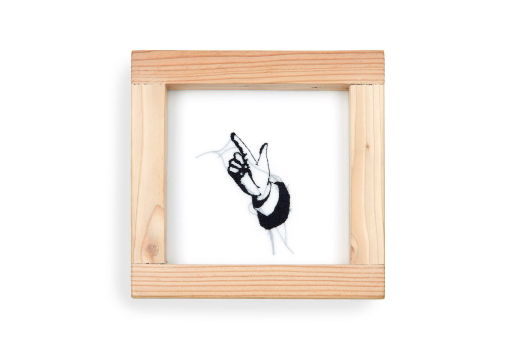 Bordados hechos a mano, con hilo negro, sobre seda tensada en marcos de madera.