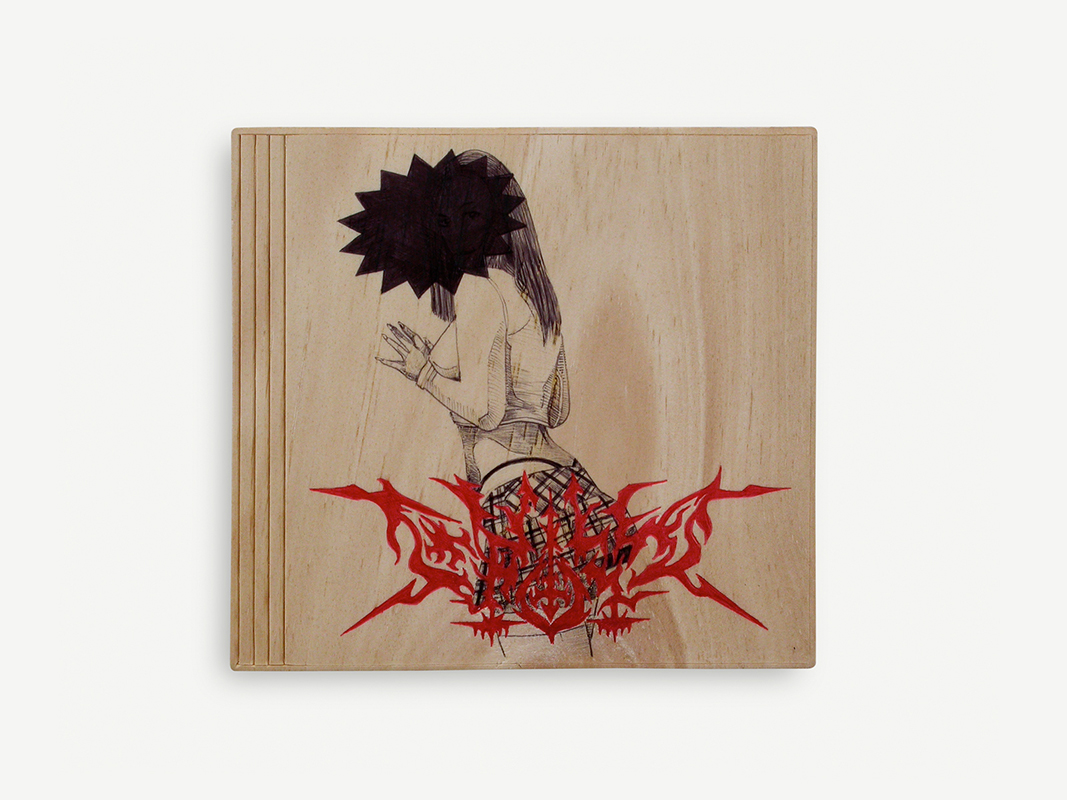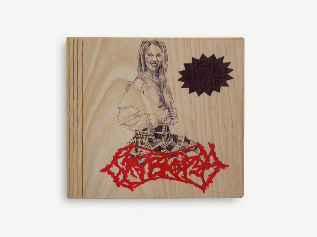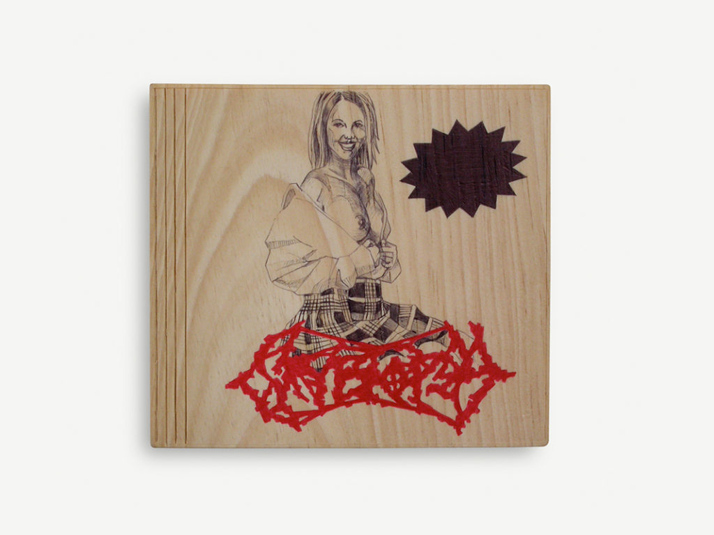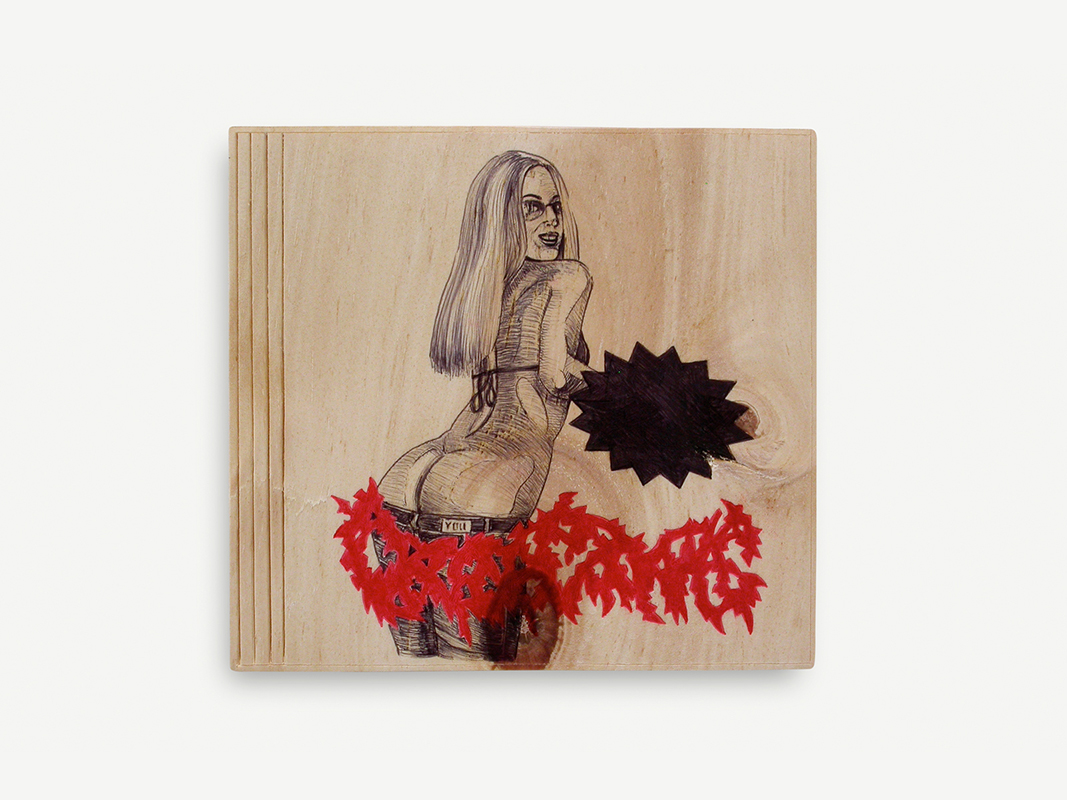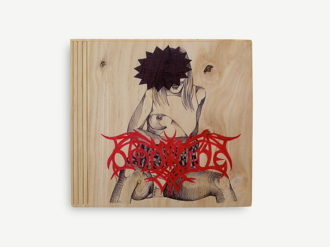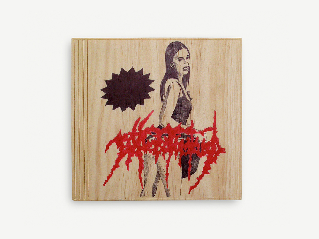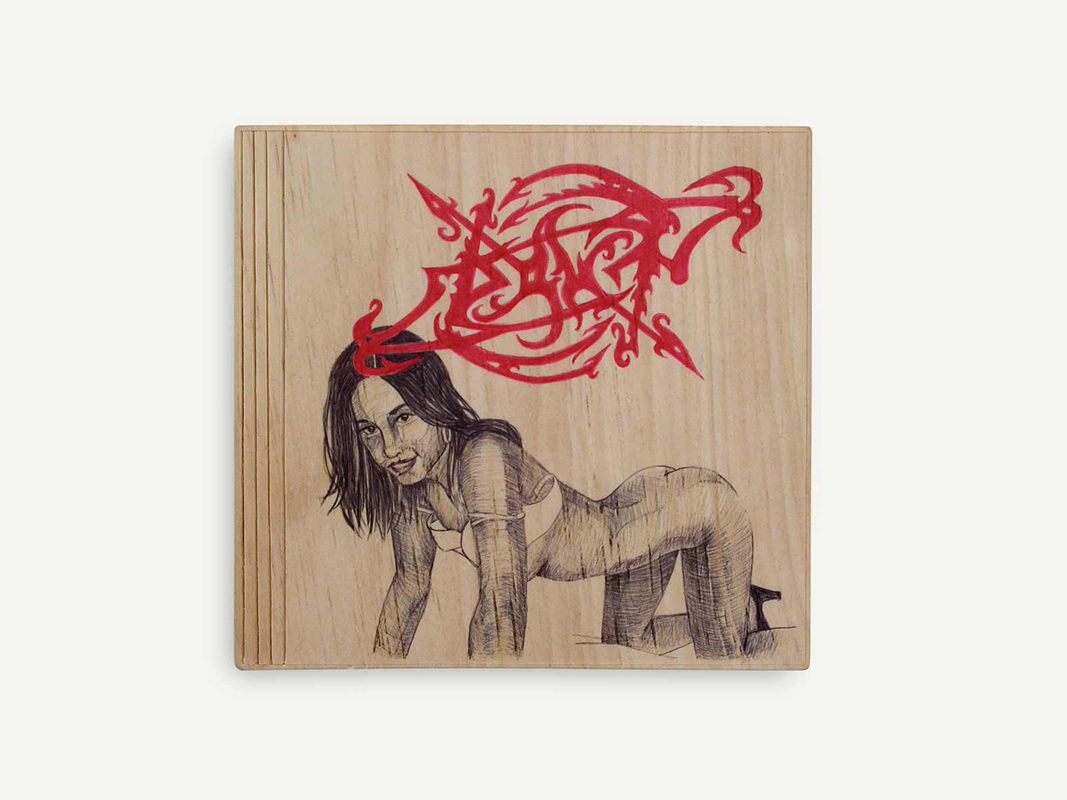 Dibujo con esfero de tinta negra y roja, sobre tablitas de madera. Cada tabla mide 14 x 12 x 1 cms. Aproximadamente.