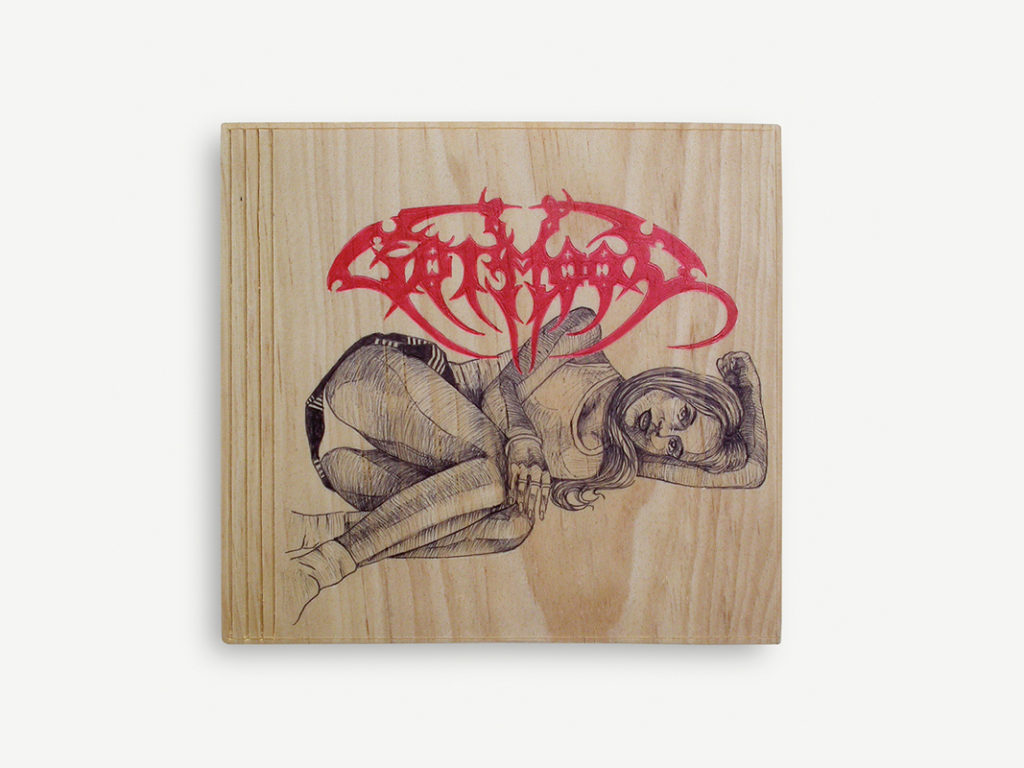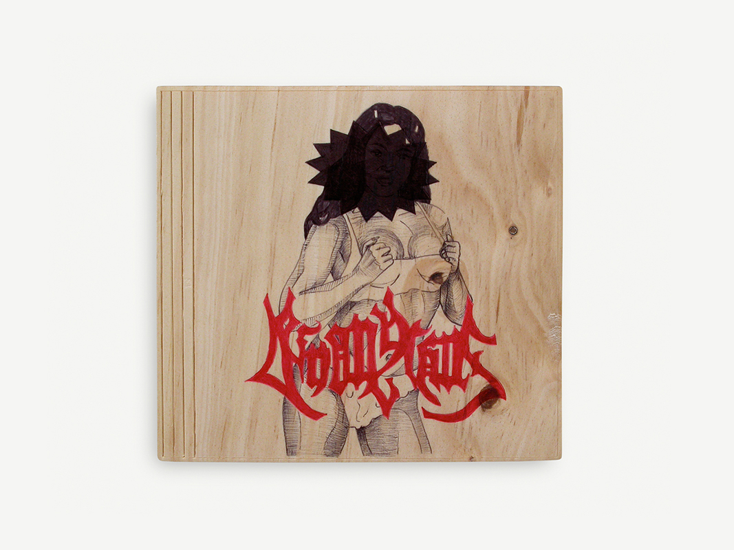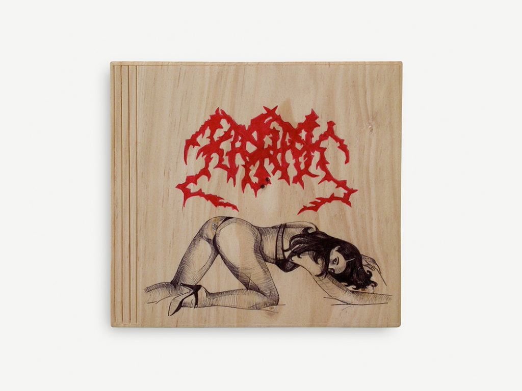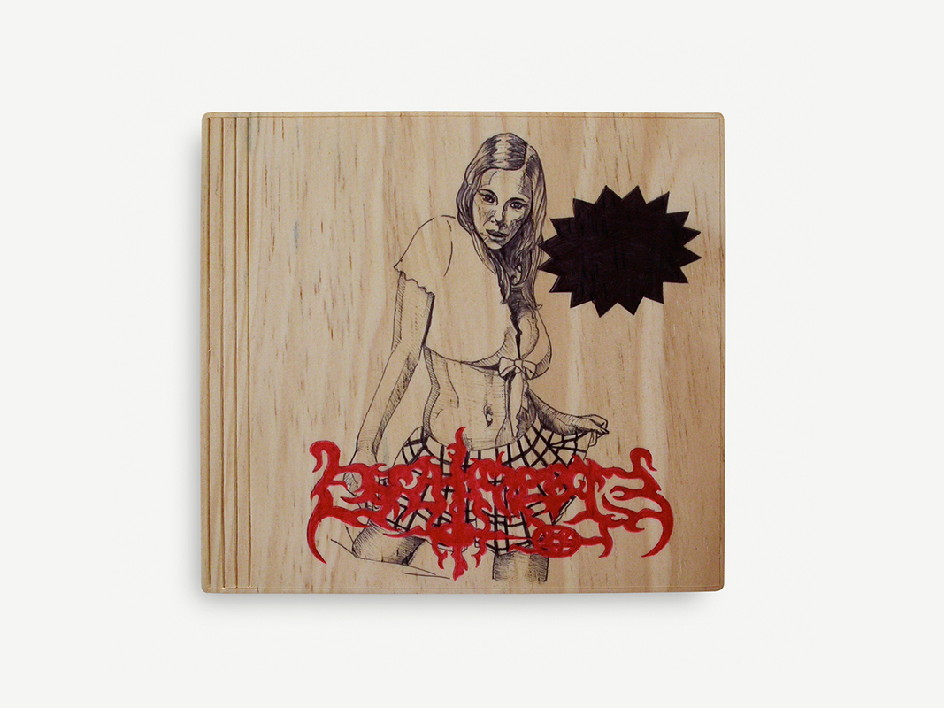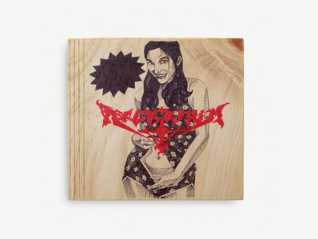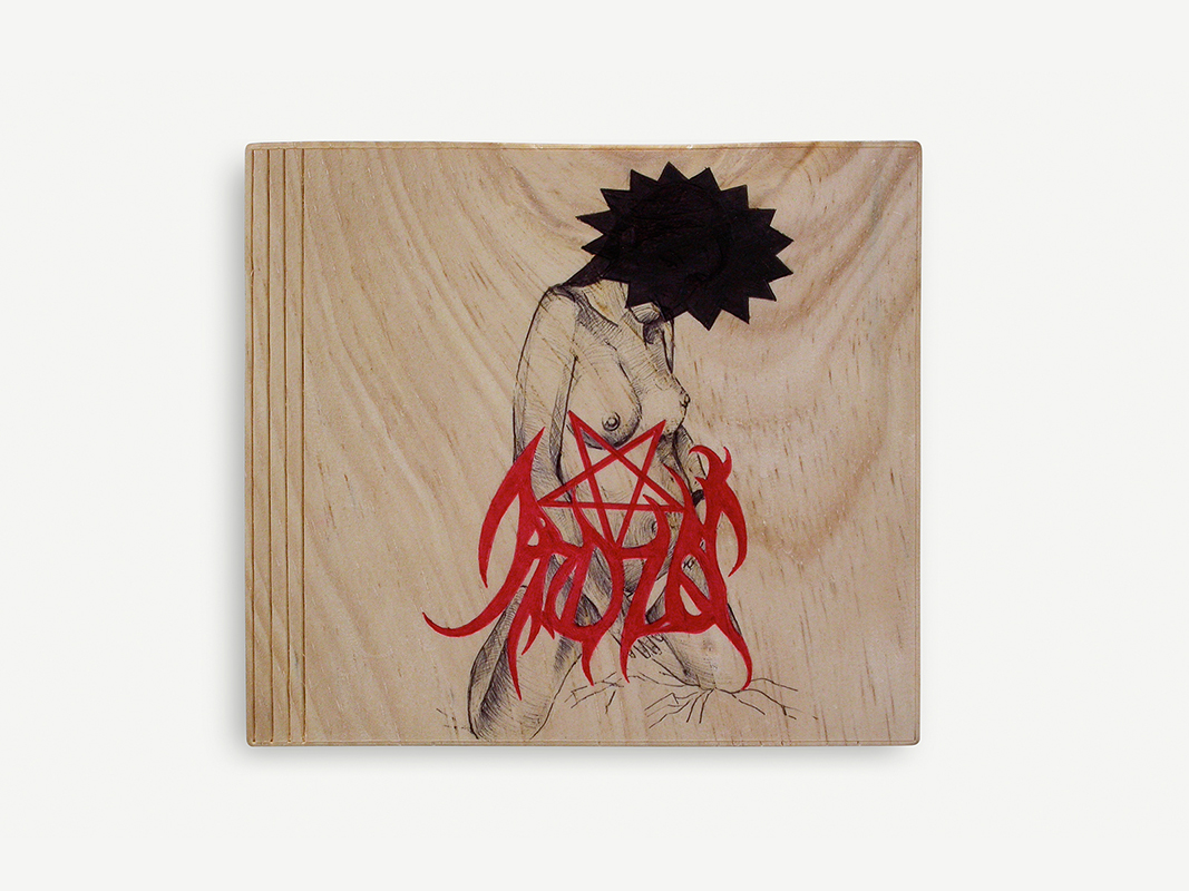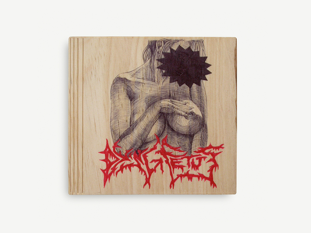 Dibujo con esfero de tinta negra y roja, sobre tablitas de madera. Cada tabla mide 14 x 12 x 1 cms. Aproximadamente.